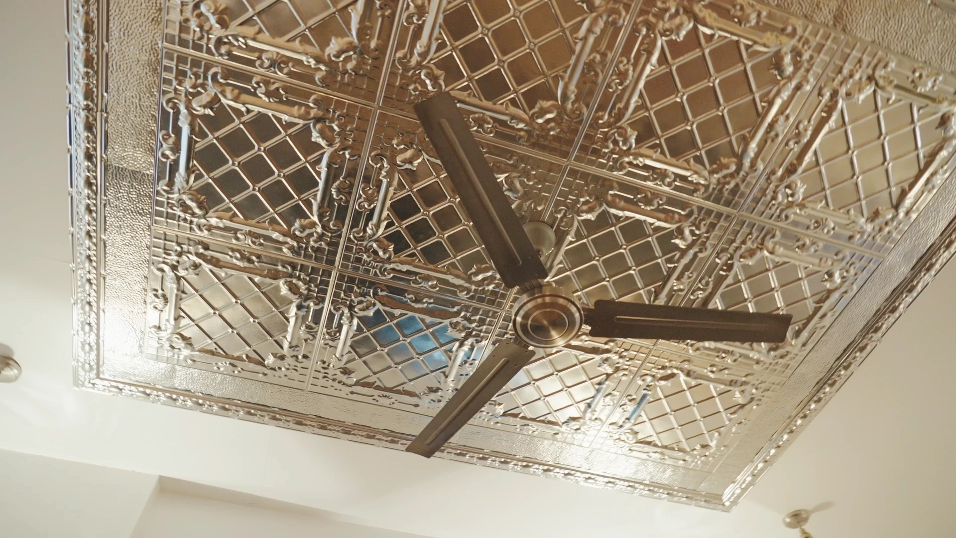 Высокие деревянные колонны и жестяной потолок высотой 3,5 метра добавляют величественности этому помещению.